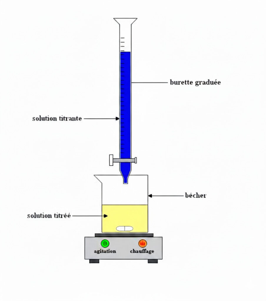 • La Burette Graduée : Contient la solution titrante (de concentration CA connue). Elle permet de mesurer très précisément le volume versé (VA).