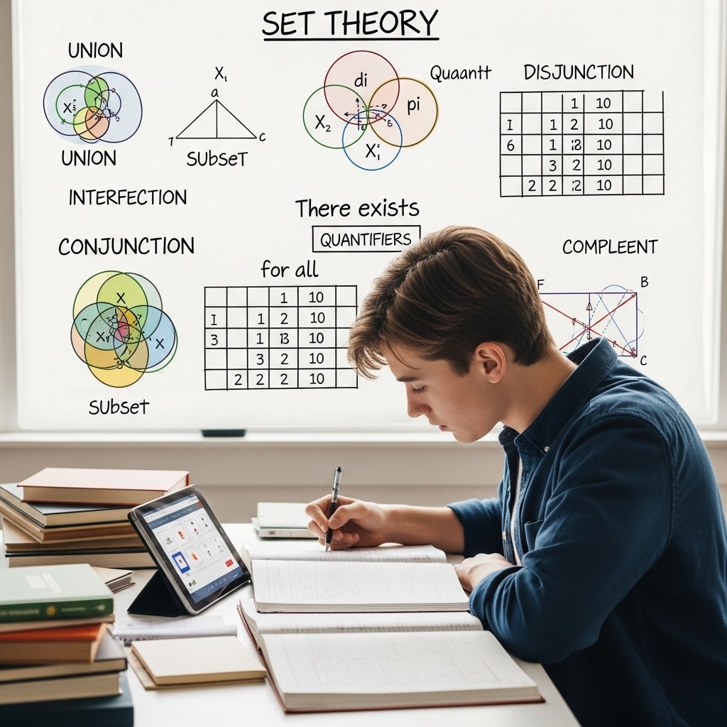 Le langage fondamental des mathématiques : ensembles, logique formelle, quantificateurs et méthodes de raisonnement avancées.
